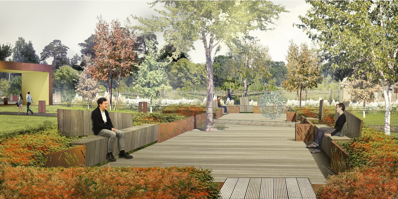 Три площади с навесами и павильонами, тематические кулуары, серия малых архитектурных форм и дизайн оборудования отсылают к важным смысловым аспектам жизни и истории города: агрокультура, часовой завод «Восток», велокультура и компоненты умного города.