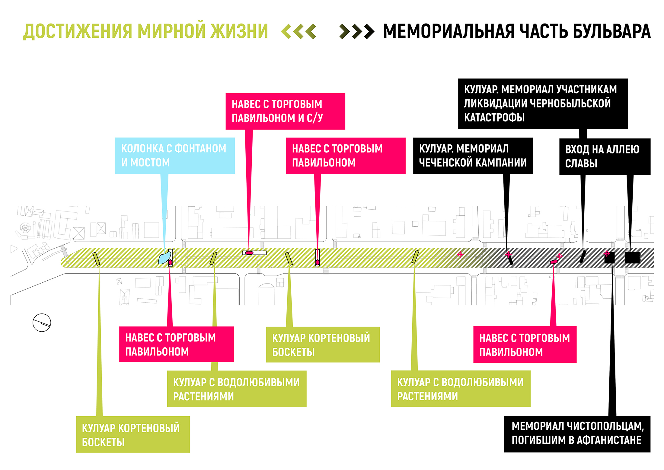 Вместе с тем дизайн-решение включает редизайн стелы, посвященной основанию города, меры по организации пешеходного и транспортного движения, автопарковок, а также меры по развитию общественных сервисов и функций на сегменте, построенном в 2017.