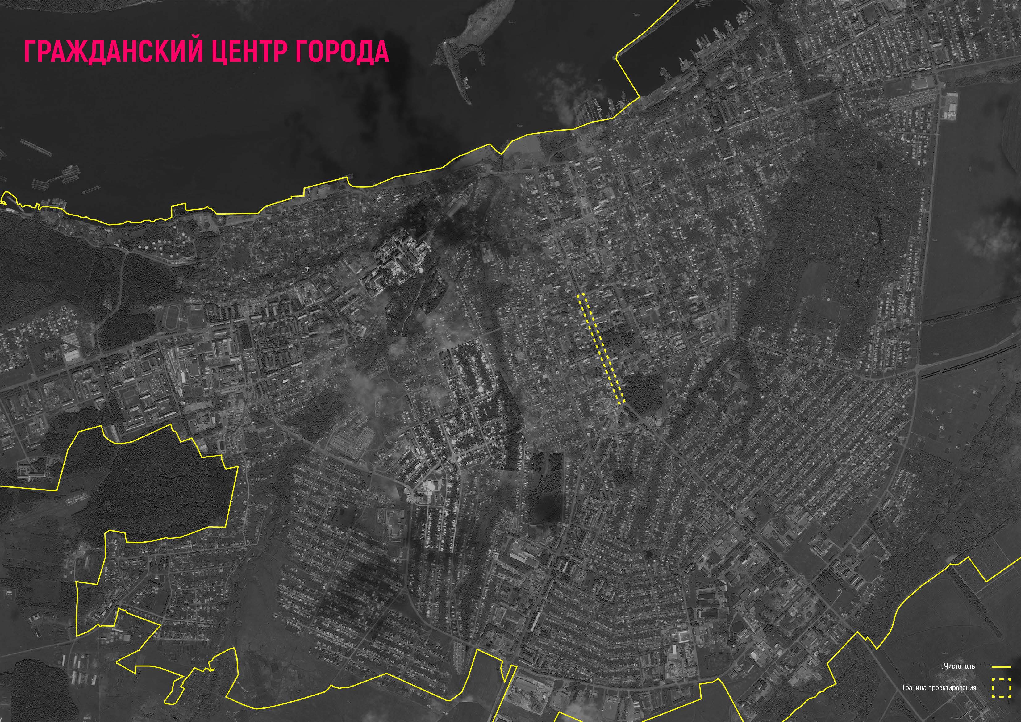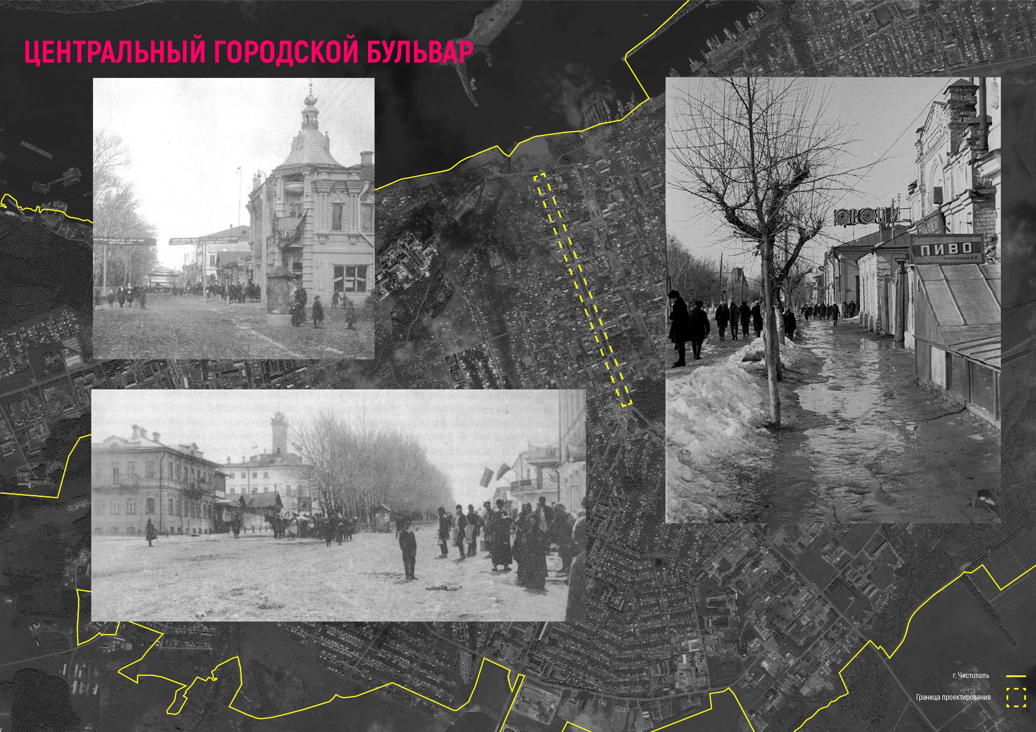 Вторая итерация развития центрального городского пространства - Центральный бульвар по улице Карла Маркса фаза#1 - тематический переход от мемориалов военных лет к достижениям мирного времени. Этот важнейший сегмент включает два кулуара, посвященных памяти жертв мирного времени - Чечено-Ингушского конфликта и Чернобыльской катастрофы, в которых приняли участие сотни чистопольцев, это живая актуальная история города.