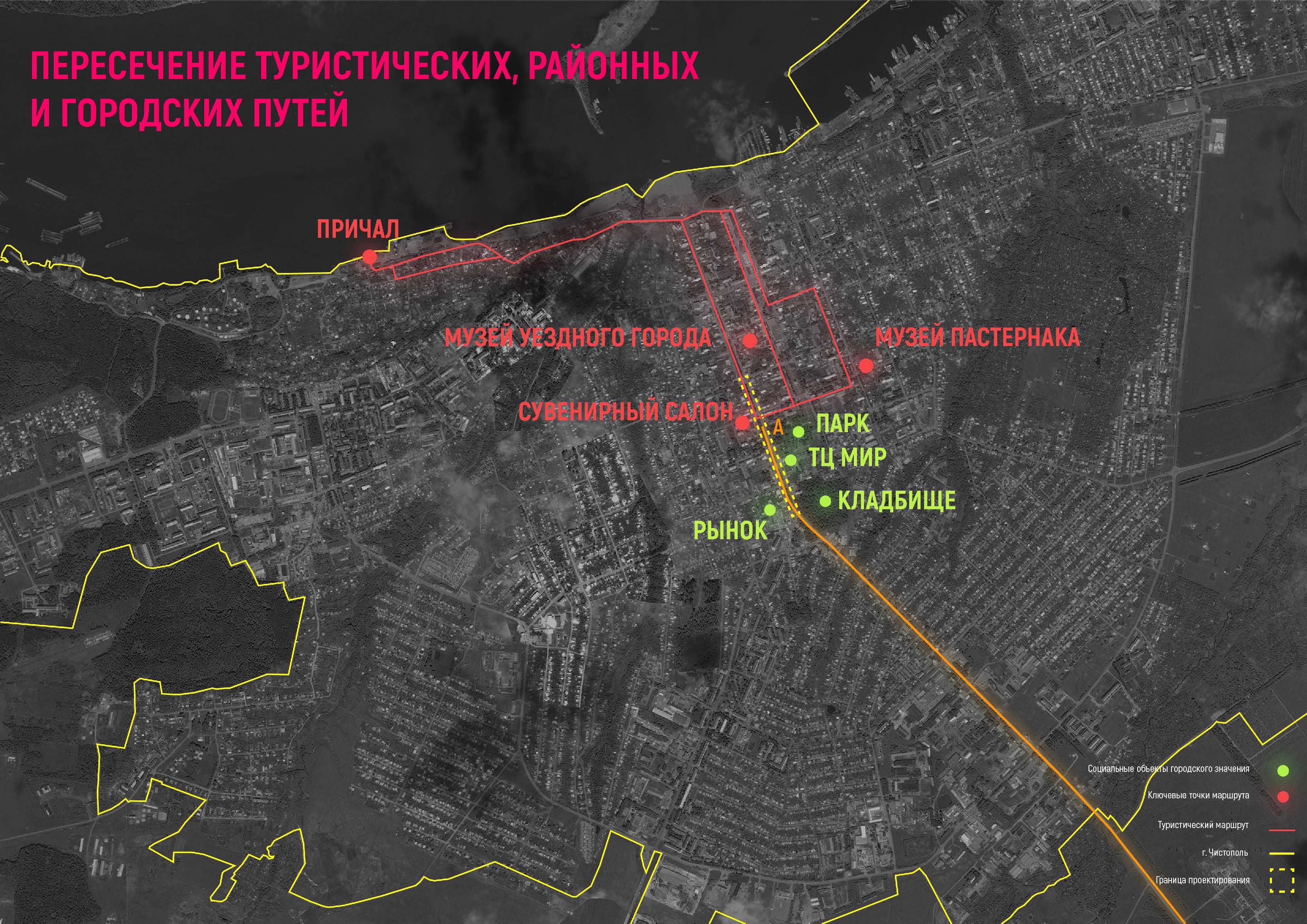 Площадка отдыха на оси бульвара между автобусными остановками - узел туристического маршрута в мемориальном сегменте бульвара. Сюда помещается стела основания Чистополь и размещаются мирные общественные функции: минимальное оборудование для самых маленьких, павильон торговли и городской туалет.