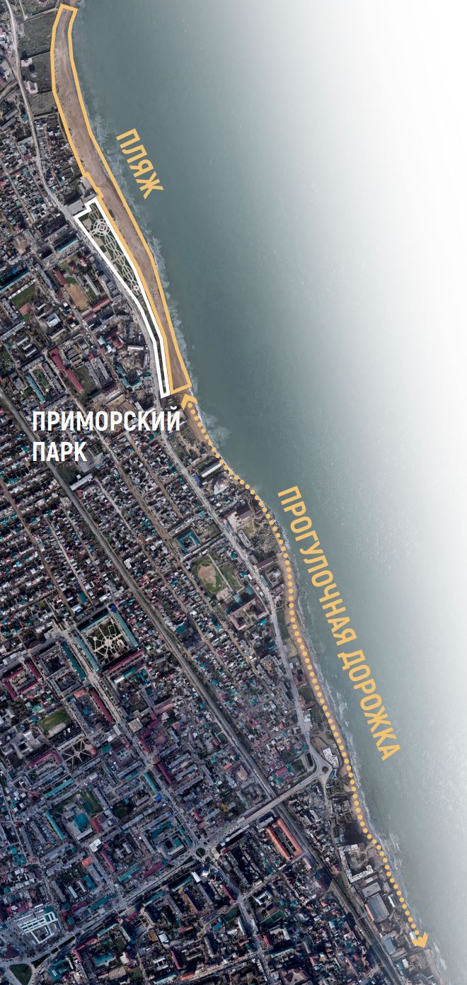 Помимо реорганизации городского пляжа проект развития береговой линии Дербента включает реконструкцию Приморского парка. Как единственно возможный на данный момент обустроенный выход к воде, парк не предоставляет жителям должной инфраструктуры для времяпрепровождения и отдыха у воды в жаркое летнее время. Поэтому преобразование парка станет следующим шагом в развитии приморского города.