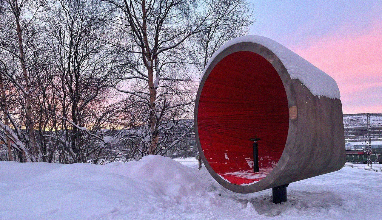 Видовая площадка реализована в рамках проекта мойзалив.рф и включает решения, адаптированные к условиям города за полярным кругом: погодозащищенные подогреваемые скамьи со встроенным освещением и знаковый объект с поворотным механизмом.